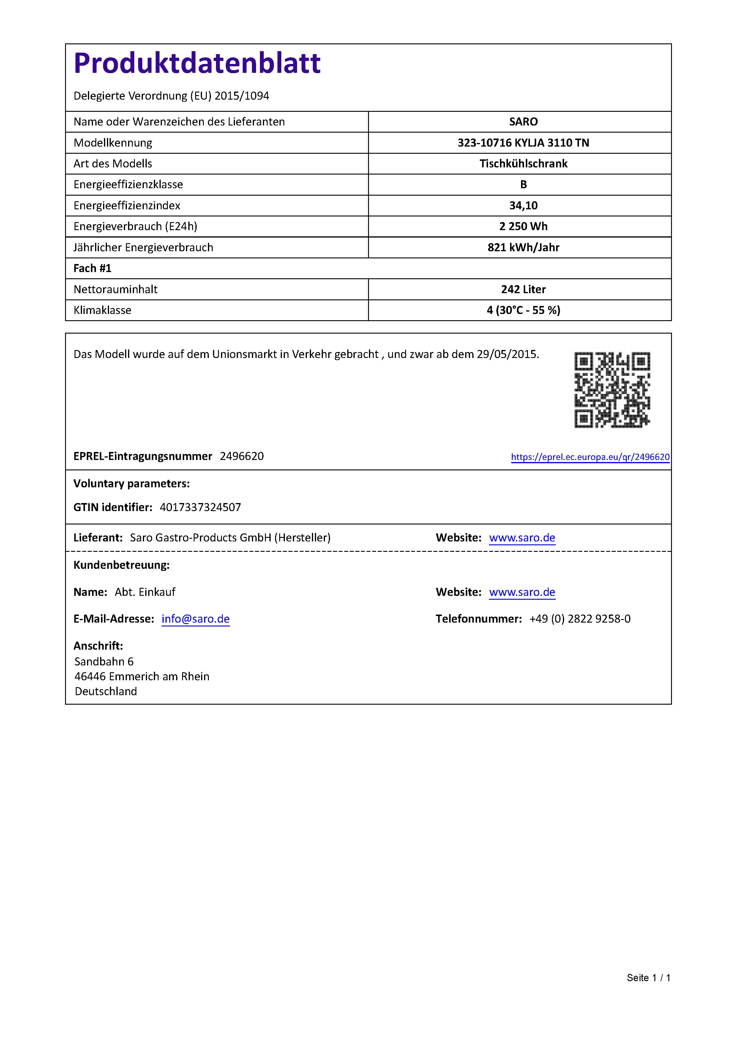 Hersteller: Saro Gastro-Products GmbH - Sandbahn 6 - 46446 Emmerich am Rhein - DEUTSCHLAND / GERMANY - info@saro.de - www.saro.de